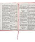 This Bible for girls showcases luxurious features that exude elegance and style. It boasts a pink satin ribbon marker, allowing her to mark her page effortlessly, and pink printed page edges that continue the heart motif and add refinement and charm to the design. In addition, thumb indexing tabs will help her navigate the books of the Bible and speed up finding a specific passage.