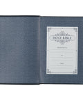 A simple, thin heat-debossed frame with petite corner scrolls decorate the front and back covers of the blue faux leather KJV Bible. A silver-foiled title is displayed within a heat-debossed banner bordered by two ornate filigree designs on the front cover. The heat-debossed version reference is presented in a simple rectangular banner in a clearly readable font at the bottom of h front cover.