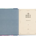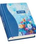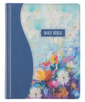 An artistically rendered composition of vivid florals burst from the printed front panel of this hardcover note-taking Bible. The front panel is uniquely curved on the left side, connecting to the similarly curved solid blue faux leather panel that wraps around the spine and back. A double row of topstitching secures this seam and is also applied to the edges of the book. A small blue faux leather patch on the front floral panel holds the silver-foiled title and is outlined with blue topstitching.