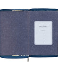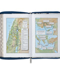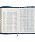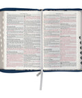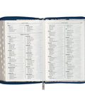 The title is repeated on the spine, where you will also find the KJV version reference. A sturdy blue zipper with a silver cross-engraved zipper pull keeps all your notes and bookmarks secure. Silver gilt-edged pages are marked with thumb indexing tabs for locating Bible books quickly, and a blue satin ribbon marker will mark the passage once you find it.