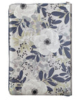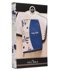 The light gray back cover of the faux leather Bible is subtly pearlized and printed with large white flowers and blue sprigs and berries. The design wraps around the spine and meets a blue curved front panel with a double row of topstitching. The curved panel houses the title in a simple silver-foiled script.