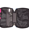 A black zipper, complemented by a silver metal zipper pull engraved with a cross, encircles three sides of the case, ensuring it closes securely. The back features a zippered pocket with a second silver cross-engraved metal zipper. With a lay-flat handle, the spine folds away to let the case completely.