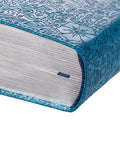 The top half of the King James Bible is wrapped in a texturized light blue faux leather while the bottom half is wrapped in a sapphire blue faux leather with a heat-debossed floral design. A navy blue band separates the two halves. The title of the Bible is heat-debossed and silver-foiled on a smooth sapphire blue patch appliquéd to the center of the design.