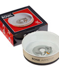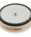 The sentiment is inscribed on the taupe-colored side of the bowl in bold charcoal gray lettering Bone Appétit!