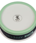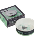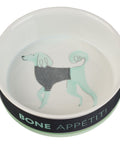 The sentiment, Bone Appétit, is printed on the side of the bowl in light gray lettering. A stately, curly-haired pup wearing a gray sweater and shaded in a pale green color is illustrated on the bottom of the bowl.
