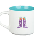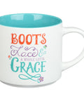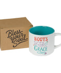 This mug is just cute as a button! Sharin’ a southern phrase we can all get behind, our Boots Lace and Grace Ceramic Coffee Mug will make your favorite drink a whole lot sweeter!A white exterior acts as a backdrop to the sentiment on this ceramic mug. The phrase is written in a variety of fun fonts in red, purple, and light blue. A small image of purple cowboy boots features on the back and adds a little bit of southern charm! The interior is colored a coordinating aqua blue with the signature Bless Your Soul imprint featured on the bottom. Dial up the cuteness on your mug shelf when you display the Boots Lace and Grace Ceramic Coffee Mug!Gift this cute mug to a coffee-drinking or tea-loving friend who could use a mug as charming as this! Gather up your ‘y’all’s and ‘yes ma’am’s and enjoy a cup from this colorful Boots Lace and Grace Ceramic Coffee Mug!