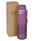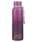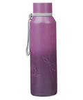El exterior de color ciruela de la Botella de agua de acero inoxidable tiene un degradado que va de claro a oscuro. Este diseño está acentuado por contornos rosados de flores. El texto esta grabado con láser.
