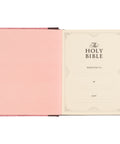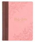 Solid brown faux leather is stretched across the back of this hardcover Bible. It wraps around the spine and meets a pink faux leather front panel with a double row of topstitching. The pink panel is decorated with heat-debossed floral corner designs placed in opposing corners. The title is gold-foiled, the version reference is heat-debossed, and both are centered on the smooth pink panel.