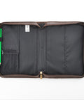 The front and back covers of the brown faux leather Bible cover is designed to mimic a rugged worn-and-torn look. A smooth, deeper brown belting strip that wraps from the front around the spine and down the back panel, creates a contrast to the distressed body. This brown belting strip holds and antique brass-tone badge with a metal cut-out cross. Brass hardware is used to attach the faux leather handle and a cross engraved brass zipper pull keeps the Bible cover securely closed. An exterior slip pocket is visible on the back cover.