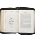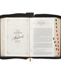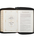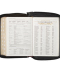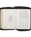 The interior pages showcase black ink printing with metallic gold decorative accents and gilt-edged page edges. The durable construction features a sturdy zipper with a convenient cross-engraved gold metal zipper pull, a lay-flat spine, two satin ribbon markers, and a thumb index. The thumb index tabs are colored black for the Old Testament and red for the New Testament. The double-column format presents the text in a clear 9.8-point font size.