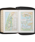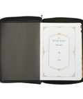 Raised ribs straddle the spine and spill over onto the covers, where cross-shaped stitching and a double row of topstitching secure the spine panel to the rest of the body of the cover. The Bible opens flat thanks to the Smyth-sewn binding and an extended black zipper that is secured to the spine by a silver snap button. A protective faux leather flap safeguards the pages from the metal zipper, ensuring the paper edges remain pristine.