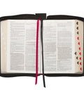 Safeguard your pages, study notes, and bookmarks with the Burgundy and Black Faux Leather King James Version Study Bible with Thumb Index and Zippered Closure. This updated KJV Bible combines the rich history of the King James Bible with fresh insights through personal devotions.