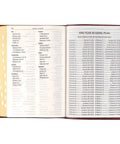 A one-year Bible reading plan is included in the back of the Bible if you wish to structure your Bible reading in such a way to read through the Bible in a year. The Bible is packaged in a full-color printed cardstock sleeve.