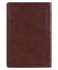 The handsome burgundy cover of the faux leather Bible is heat-debossed with a scrolled edge frame. The tile is gold-foiled and sandwiched between two filigree flourishes.