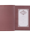 A beautifully designed presentation page is included in the front of the Bible to complete when the Burgundy Faux Leather Full-size Giant Print King James Version Bible with Thumb Index is given on a special occasion.