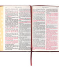 A satin burgundy ribbon acts as a page marker, and black thumb indexing tabs makes it easy to find a book in the Bible. Shimmery gilt-edged pages add luster to an already beautiful Bible. The Smyth-sewn flexcover Bible opens flat with no damage to the spine.