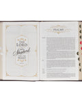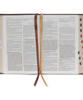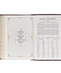 This Bible stands out with its captivating cover design, and its remarkable features extend to the inside as well. Meticulously printed pages boast elegant black ink and are adorned with metallic gold decorative accents. Two satin ribbon markers are included for easy navigation. The text is presented in a clear 9.8-point type, organized in a convenient double-column format. With its Smyth-sewn binding, the Bible opens seamlessly, ensuring the spine remains protected from any damage.