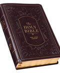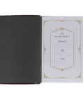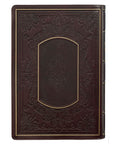 Turn over the Bible to the back cover to find a matching design with a distinct heat-debossed pattern within the arch. The spine proudly displays the title, version reference, and six decorative gold-foiled spine ribs, adding a touch of sophistication.