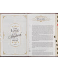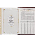 The back cover mirrors the beautiful frame, and the gold-foiled title and KJV version reference on the spine, complemented by meticulously heat-debossed lines, bands, and gold-foiled accents, add a touch of refinement. The gilt-edged pages complete the exterior, providing a regal finishing touch.