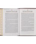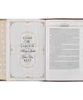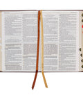 Designed with durability and convenience in mind, this Bible boasts a lay-flat spine that ensures effortless reading and study sessions. Marking significant pages becomes effortless with the inclusion of two satin ribbon markers, and navigating through the Bible is a breeze, thanks to the thumb index. The interior pages, elegantly printed in black ink, are adorned with captivating metallic gold decorative accents. The text is presented in a double-column format and features a comfortable 11-point typeface, inviting unhindered exploration.