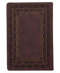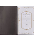 The burgundy faux leather Bible is adorned with an elegant Greek-themed frame that boasts meticulous heat-debossing and gold-foiling. The centerpiece of this masterpiece is the title, beautifully presented in large, gold-foiled letters, perfectly centered within the captivating frame.