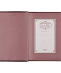 A simple heat-debossed double frame design with petite corner scrolls decorate the front and back covers of the faux leather KJV Bible. The title is heat-debossed and gold-foiled in a bold font and sandwiched between two scroll designs. The version reference is also heat-debossed and gold-foiled but is presented in a markedly smaller yet clearly legible font.