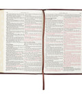 The large, 10-point type is slightly larger than the standard print found in most Bibles, and the thin silhouette makes it easy to hold this Bible in your hand or place it in a backpack. The lay-flat binding of the faux leather cover allows your Bible to fall open effortlessly and is useful for positioning on a table. The Bible comes packaged in a full-color printed cardstock sleeve.