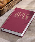 The durable burgundy hardcover Bible displays a gold-foiled title and version reference on the front cover and spine.