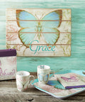 The Butterfly Blessings Collection's Grace Wooden Wall Plaque offers a presentation that will engage gardeners and butterfly lovers alike. Featuring the artwork of Jane Shasky with her fresh botanicals embellished with elegant calligraphy fashioned as a carte postale serving as a background for a signature blue butterfly. Not only beautiful on your wall, the message from Ephesians 2:8 will offer inspiration with each glance.