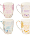 Each mug in this set of four features the artwork of Jane Shasky. Her fresh botanicals and elegant calligraphy set a wraparound carte postale background for each piece’s signature colored butterfly, with the corresponding Scripture displayed on the back of the mug.