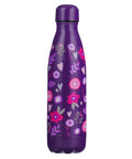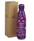 The purple stainless steel water bottle is decorated with raised pink flowers and fronds. The sentiment is screen-printed in white and pink letters.