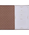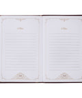 The elegantly bound book offers a beautiful aesthetic with its brown faux leather cover that is decorated with a heat-debossed frame adorned with intricate corner scroll designs. The title is accented with more heat-debossed scrollwork and features beautiful gold-foiled letters that exude timeless charm.