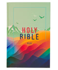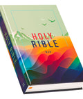 The cover of the hardcover children's Bible features a breathtaking multi-colored vista, with a majestic snow-capped mountain towering in the background. Above the scene, wild birds soar gracefully, capturing the imagination. Amidst this awe-inspiring landscape, the title shines brightly in eye-catching blue and red letters, setting the stage for the enriching journey that awaits within.