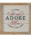 The Come Let US Adore Him Framed Wooden Wall Art is part of the O Come Let Us Adore Him Collection. This collection includes a ceramic coffee mug, resin ornament, ceramic ornament, ceramic plate, paper napkin set, wall art piece, and a gift bag.