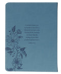 The devotional is wrapped in a blue faux leather cover adorned with heat-debossed and screen-printed flowers that pop in pink and blue. The bright yellow centers of the colorful flowers correspond to the title, which is presented in simple yellow letters on the front cover.
