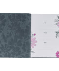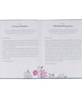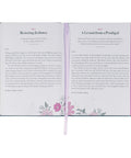 Gilt edging adds metallic color to the page edges, creating a luxurious feel, and a satin ribbon marker serves as a practical and elegant bookmark. The two-color printing and decorative floral accents on the interior pages reinforce the devotional's floral theme. These features work together to elevate the book's presentation, making it an attractive gift for any occasion.