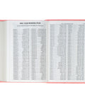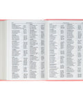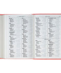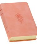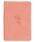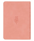 The coral pink faux leather front cover is heat-debossed with a single blooming peony. On the back, a slightly smaller floral design is repeated in the center of the cover. 6 heat-debossed faux spine ribs frame the Bible's rose gold-foiled title and translation name on the spine.