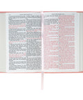 Matching rose gold highlights the gilt-edged pages. This Bible is bound with a Smyth-sewn lay-flat spine to open fully for comfortable reading wherever you are. A satin ribbon marker, attached to the spine, is helpful to mark your page.