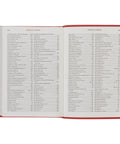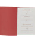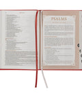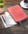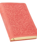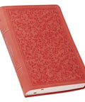 The Bible's cover is wrapped in rich coral faux leather with a beautiful, heat-debossed floral vine design that is captured by a heat-debossed framed border. The title is displayed in gold-foiled letters on the spine, accented with heat-debossed and gold-foiled faux ribs.