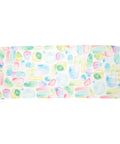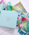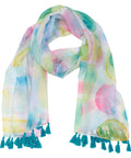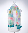 The scarf's abstract design features pastel pinks, teals, and yellows, reminiscent of shimmering sea glass. Sheer material gives the scarf a feminine and floaty feel, and vibrant teal tassels trim the edges. The scarf comes nestled in a light blue box with a full-color printed interior that matches the scarf's design. The sentiment is presented in framed rose gold-foiled letters on the lid.