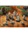 This delightful 11-piece set resembles hand-knitted figures with porcelain faces. Each piece is detailed in soft grey and white tones that evoke a cozy winter sweater feel. The set is made from durable resin and includes Baby Jesus in a manger, Mary, Joseph, the Three Wise Men, a shepherd holding a lamb, an angel, and several animals—a donkey, a cow, and a sheep, all looking in adoration at the Christ child. The small size of each figurine makes this set ideal for display on mantels, shelves, or as part of a larger holiday setup.