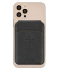 The black phone wallet for men is constructed from quality faux leather with the look and feel of Italian leather. On the front, a card slot with a thumb notch is heat-debossed with a cross, and contrasting tan topstitching along the edges adds visual interest and strength. Inside, the polished design includes a clear ID slot and three cardholder slots. Open the wallet and use it as a stand to hold your phone in place while you watch TV or join a video call. The wallet is equipped with strong magnets that provide a secure fit. MagSafe technology ensures it attaches firmly to your phone without affecting the magnetic strips on your cards. This phone wallet is compatible with all MagSafe phones and iPhone 12 models or later. If you don't have either, simply place a MagSafee sticker on your Android phone so you can use the wallet.