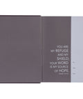 Gold gilt-edging is applied to the page edges of the devotional Bible, and its walnut brown cover is adorned with a single modern gold-foiled and heat-debossed cross positioned in the middle near the right side of the front cover. The title is displayed in gold-foiled letters on the spine, and the version reference is heat-debossed.