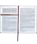 The devotional Bible comes with a handy ribbon marker, making it easy to track your progress. The text is printed in two colors, black and brown, providing a distinctive reading experience. Its single-column format and lay-flat binding ensure comfortable access to all text, which is set in an easy-to-read 10-point font. Additionally, there's a presentation page at the front of the Bible that can be personalized when given as a gift.
