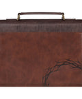 The Bible case has a two-tone brown design with a chestnut brown font cover that is heat-debossed with a crown of thorns in the lower right corner. This panel is connected to espresso-brown faux leather that wraps around the spine and fills the back. Durable topstitching around the edges and the seams ensures a strong connection. The back cover has a slip pocket, where you will find a gold-foiled Scripture verse to support the cover design.