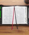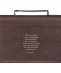 This classic Bible cover, with its meaningful reminder, is also protective and functional. It has a sturdy espresso brown faux leather lay-flat handle that is anchored with antique brass hardware. The wraparound zipper has an antique gold zipper with a smooth gliding motion and a faux leather zipper pull tab. Inside, two elastic pen loops hold pens or highlighters securely, and two satin ribbon bookmarks—one black and one deep red—help keep your place.