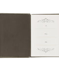 - Gray cover with gold-foiled frame and heat-debossed corner scrollwork design