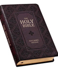 The exquisitely designed cover of the Dark Brown Faux Leather Giant Print Standard-size King James Version Bible with Thumb Index reflects the importance of its content.