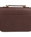 A chocolate brown panel wraps around the back cover of the faux leather Bible case and spine and connects to a toffee-colored faux leather front panel with a double-row topstitch. Corner accents in chocolate brown faux leather, also with double row topstitching, mimic the classic half bound bookbinding style and add a vintage feel to the design. The smooth toffee-colored front panel is heat-debossed with a Scripture verse taken from the Book of Joshua.