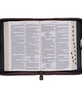 An easy-to-carry faux leather handle is attached with brushed gold metal hardware and folds completely flat when the cover is opened. This Bible case also comes with an exterior slip pocket and two interior pen loops, so you can keep all your materials safe in one place. Brown topstitching borders the edges and panels, lending durability to the design. The brown faux leather zipper pull glides closed smoothly to keep the Bible within entirely secure.
